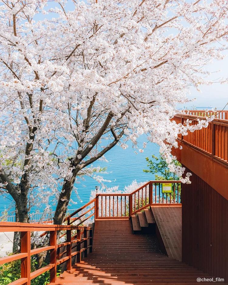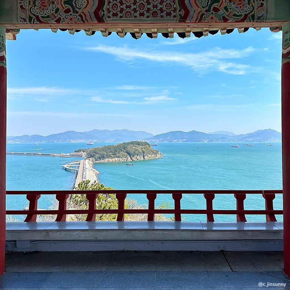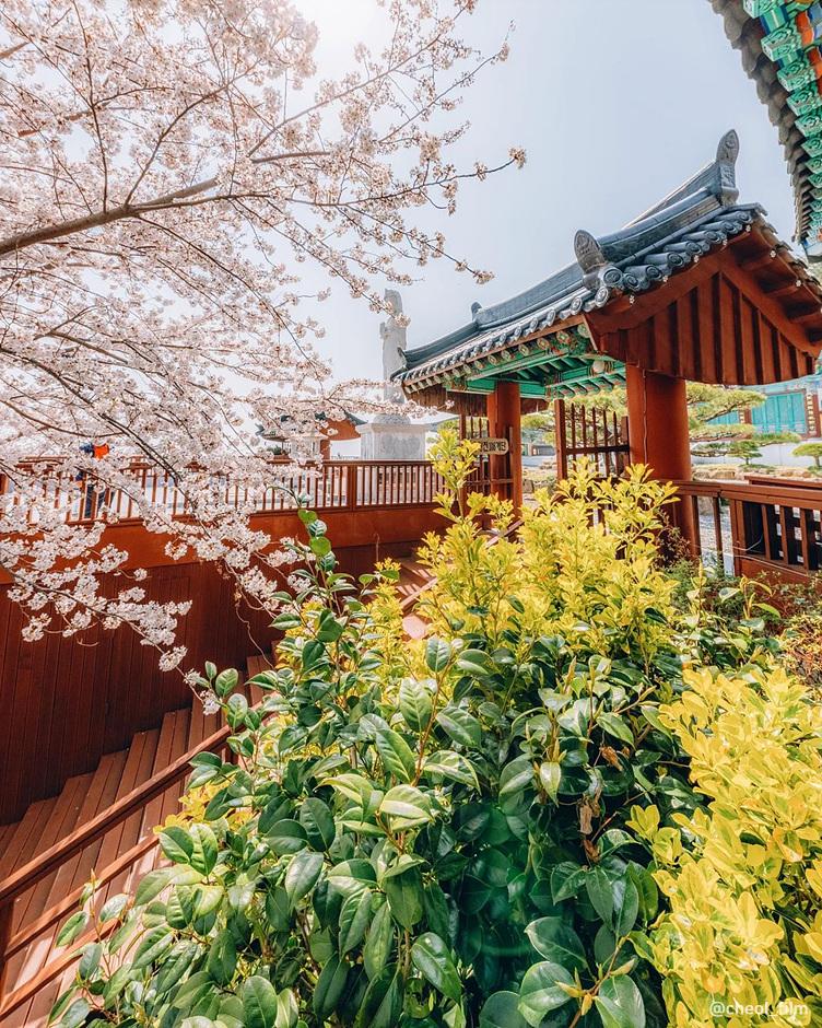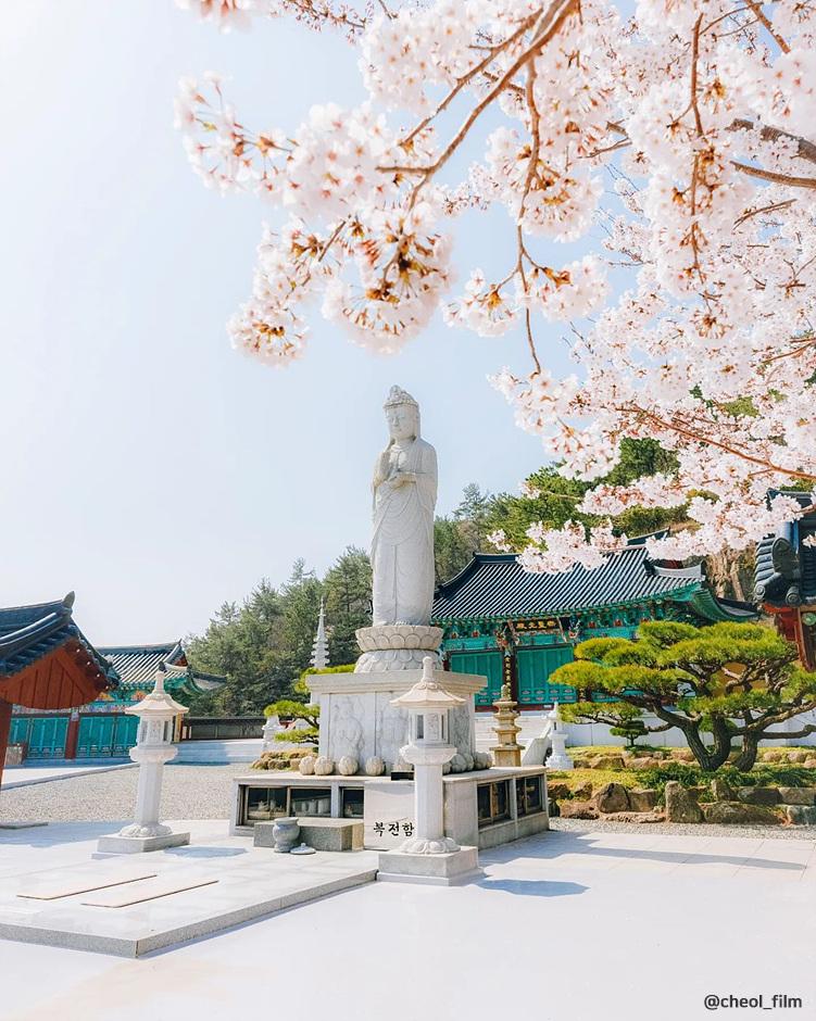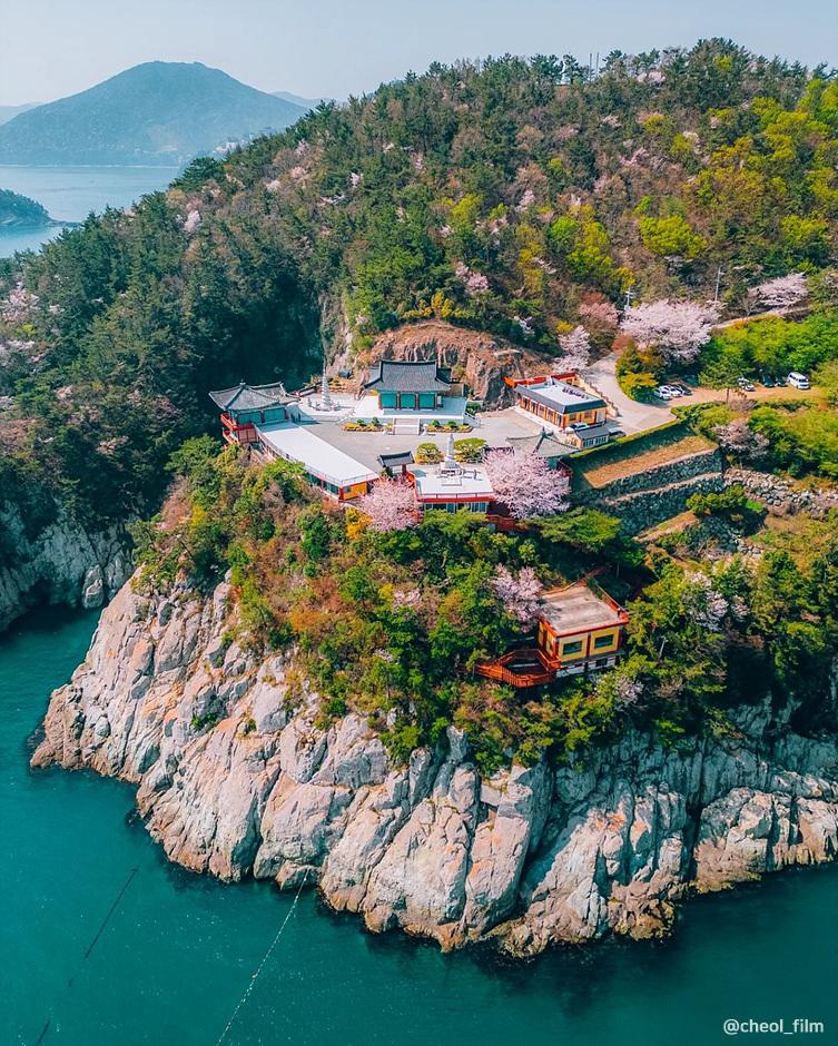 해안 절벽 위에 위치한 이 사찰은 바다 위 사찰로 불리며, 봄철에는 벚꽃과 철쭉을 감상할 수 있습니다. 바닷가 쪽에는 큰 벚꽃나무가 있어 푸른 바다와 벚꽃이 어우러진 이색적인 풍경을 제공합니다.